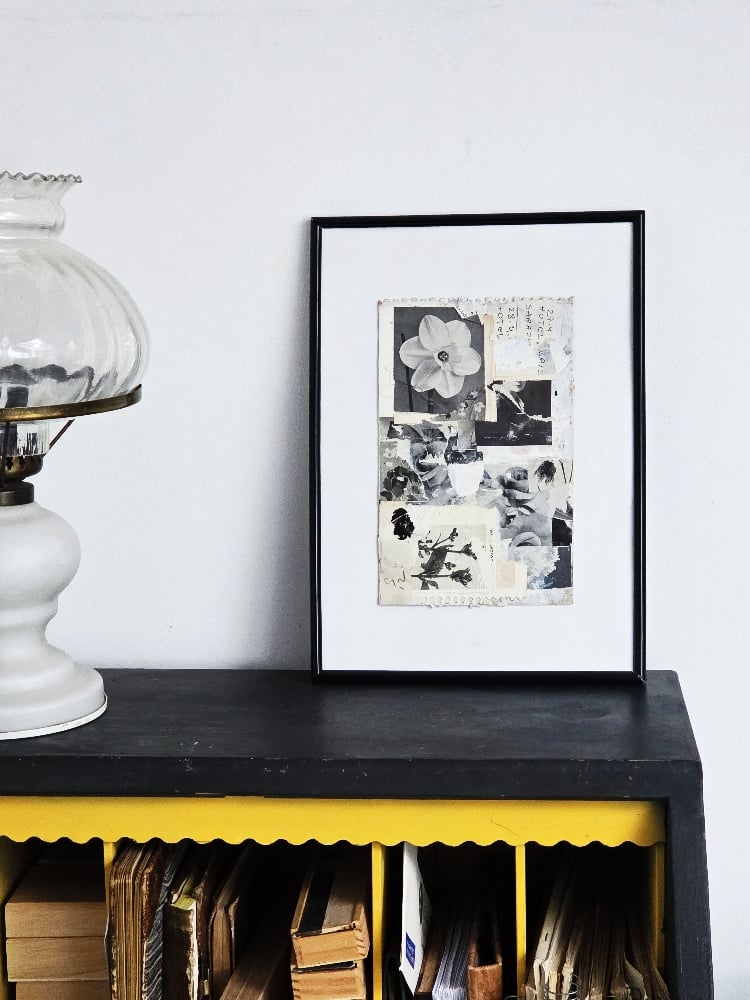 an original handmade collage created on vintage paper, layered with aged ephemera rich in texture and history. A delicate floral image emerges from the layers.