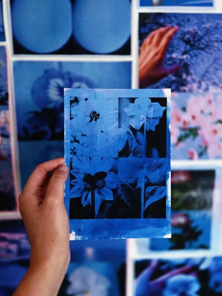 'Fourl Flowers' - photograph printed on acrylic with oil in shades of blue and little pink accents